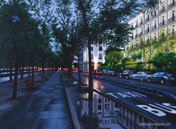 Nacida en Madrid. Licenciada en Historia por la Universidad Complutense de Madrid y Grado Superior de Piano en el Real Conservatorio Superior de Música de Madrid. De estilo realista, mi pintura representa escenas cotidianas. Busco entornos reales descritos con detalle. Me inspiro en las ciudades, sus calles, sus ambientes y en la naturaleza cambiante y efímera.